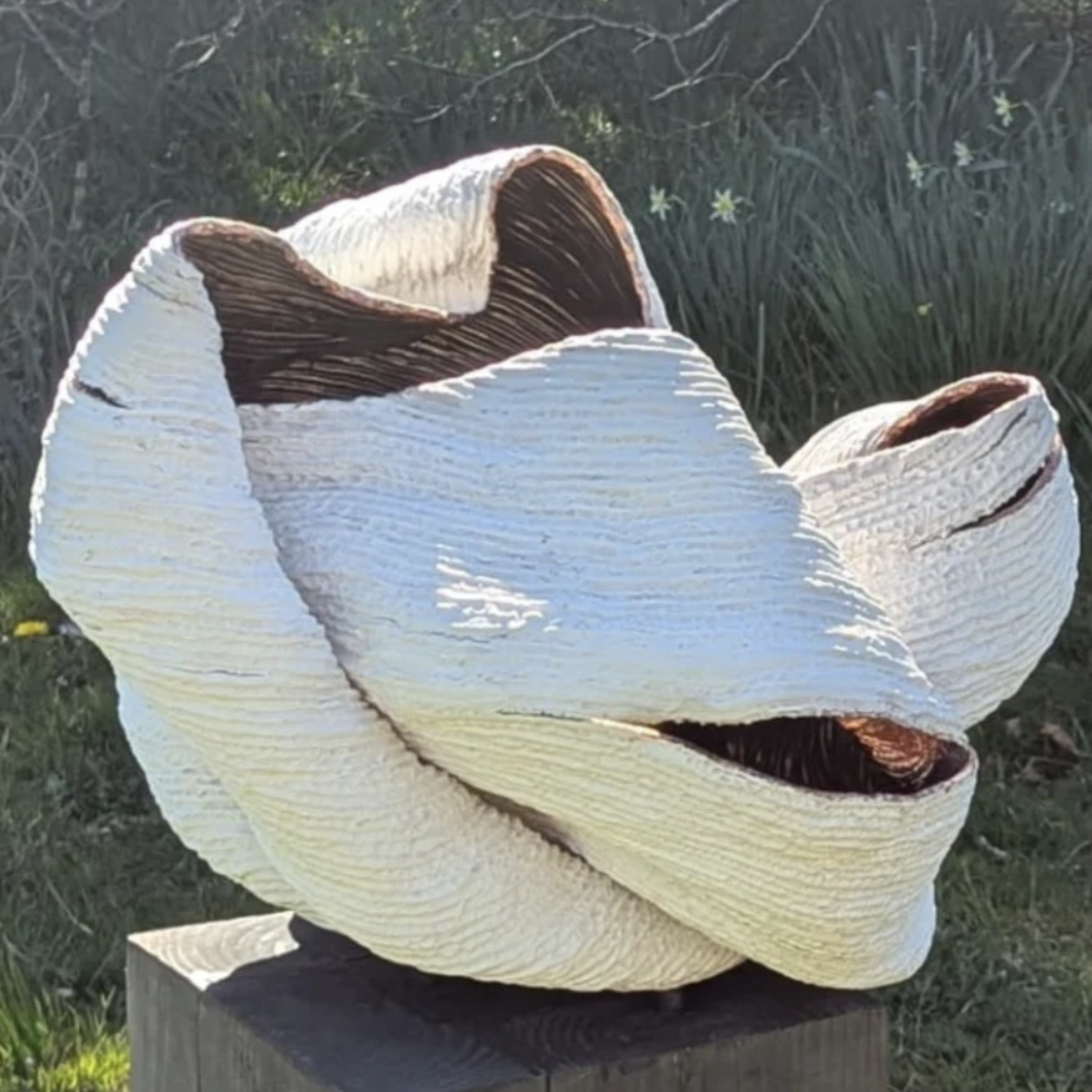 Zoe Clare’s work bridges the beauty of nature with sculptural innovation, creating forms both bold and delicately layered. Inspired by botanical rhythms and the shifting movements of the ocean, her organic sculptures emerge robust yet delicate. Textured exteriors contrast luminous, intricately finished interiors, creating a dynamic interplay suggesting depth, motion, and tension between permanence and change.