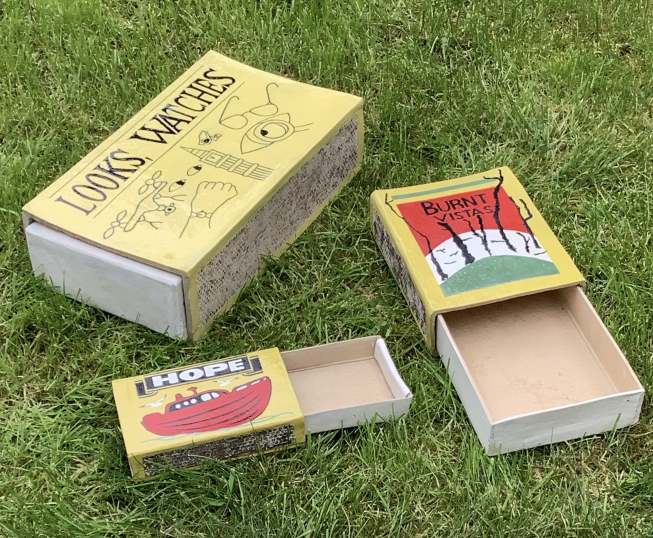 Subverted matchbox designs are enlarged and executed in clay but made to resemble cardboard. Dwarfed by being outside, these ceramic sculptures appear miniature. They feature spoonerisms of popular matchbox brands, highlighting challenges to humankind. Georgie Phipps is a ceramicist based in Cornwall; her current preoccupation is with packaging.